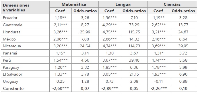Secundariamente, si bien escapa al alcance del presente trabajo analizar la influencia del contexto nacional sobre la probabilidad de resiliencia, cabe mencionar que se aprecian divergencias entre los países al incluir efectos fijos en los modelos. Así, con respecto a la base que es Argentina, tienen mayores probabilidades de ser resilientes las escuelas de la mayoría de los países de la región, con la excepción de Costa Rica, Cuba, República Dominicana y Uruguay.