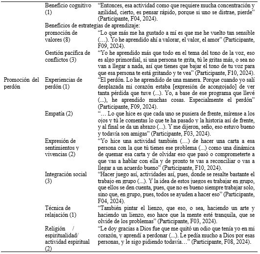 Los hallazgos del análisis del grupo focal revelaron juegos del agrado de la población, que fueron expuestos por los participantes, y permitieron identificar características de las actividades lúdicas, estrategias de aprendizaje, beneficios de las actividades lúdico-pedagógicas y aspectos para la promoción del perdón, según las categorías emergentes (ver Tabla 1).