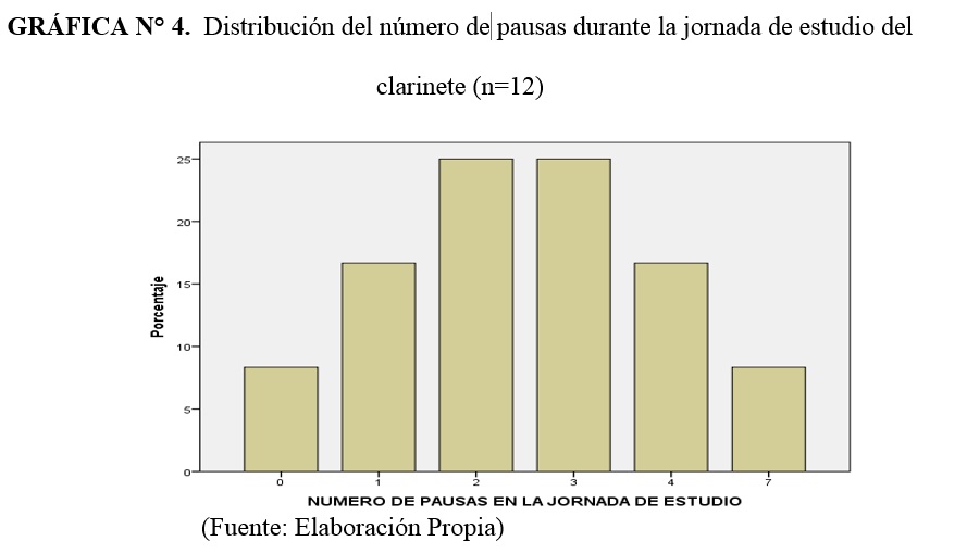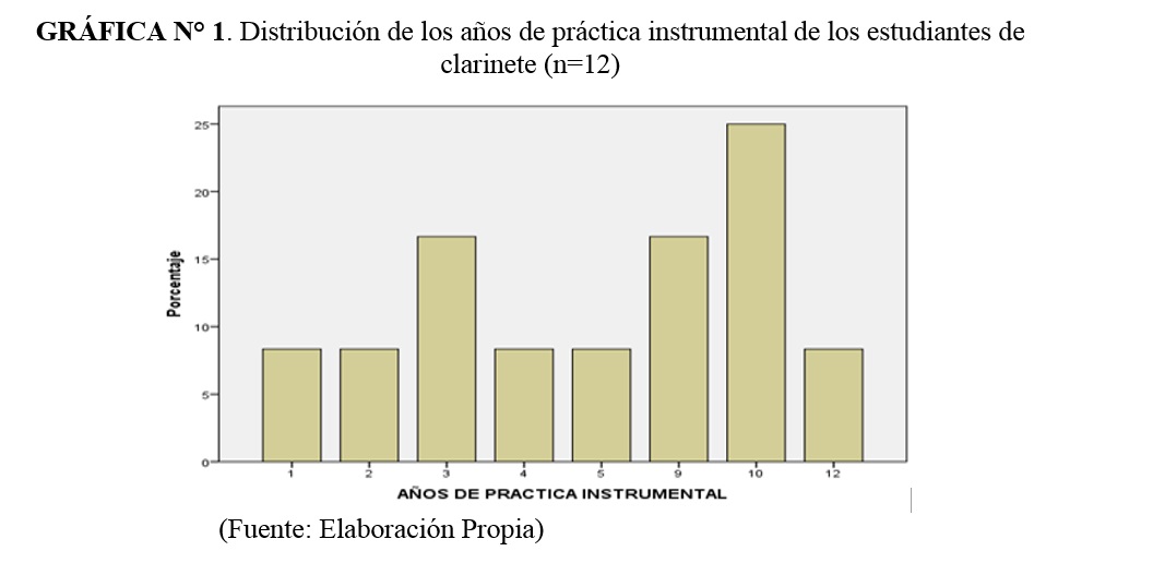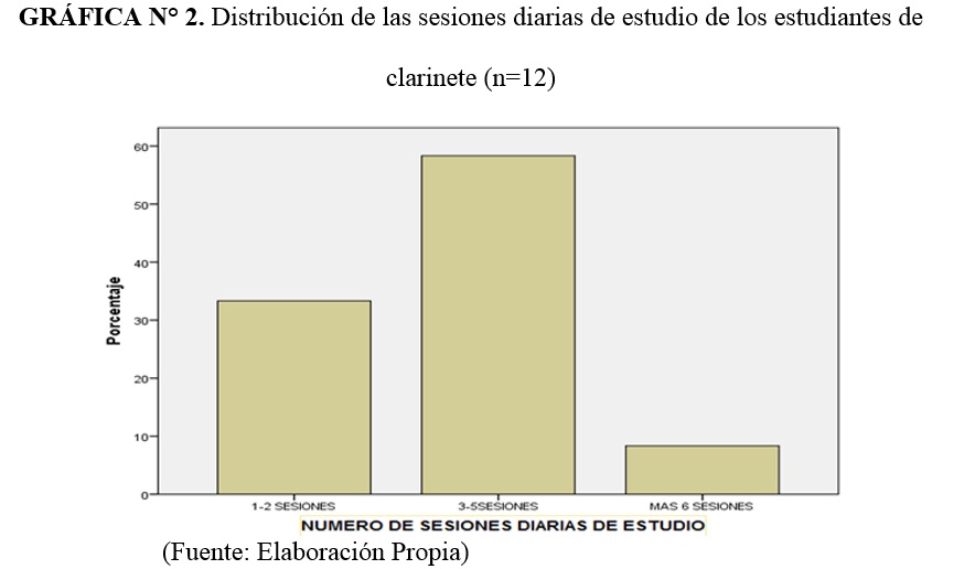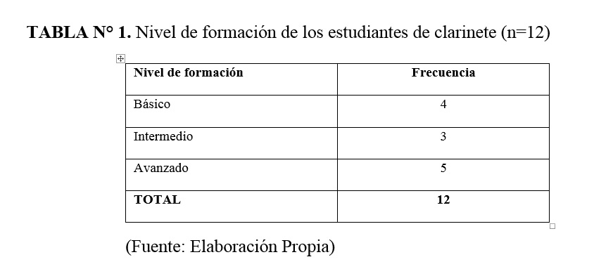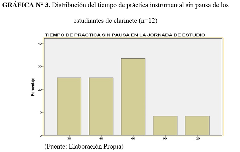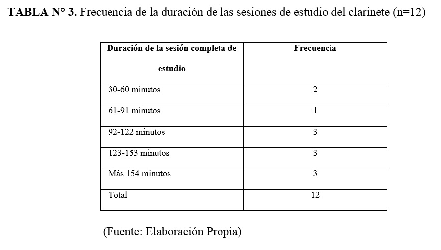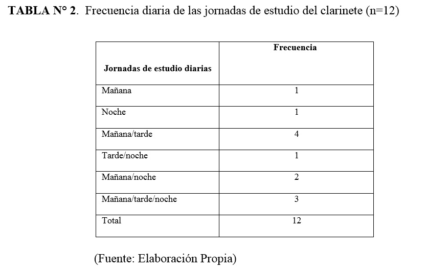Se realizó una investigación para conocer los hábitos de estudio de estudiantes de clarinete, en 3 instituciones de la ciudad de Cali-Colombia. Un estudio descriptivo transversal, usando una encuesta sobre los tiempos de estudio, posturas, periodos de descanso etc. La muestra fue 12 estudiantes entre 18 -36 años. Respondieron que llevaban más de 5 años de interpretación y estudiaban 3 a 6 días a la semana, 2 a 3 sesiones diarias. Practicaban entre una hora y media a 3 horas. Estudiaban sin pausa por 40 minutos o más, las pausas fueron variables. No realizaban ejercicio físico o de calentamiento/entrenamiento. La prueba de Fisher p=0.061, mostró una tendencia alta en relación con la duración de sesiones de estudio regular y de estudio para recitales, exámenes o presentaciones. No hubo diferencias significativas entre los hábitos de estudio y el nivel de formación. Conclusión: los estudiantes no tienen una forma estandarizada de estudio.