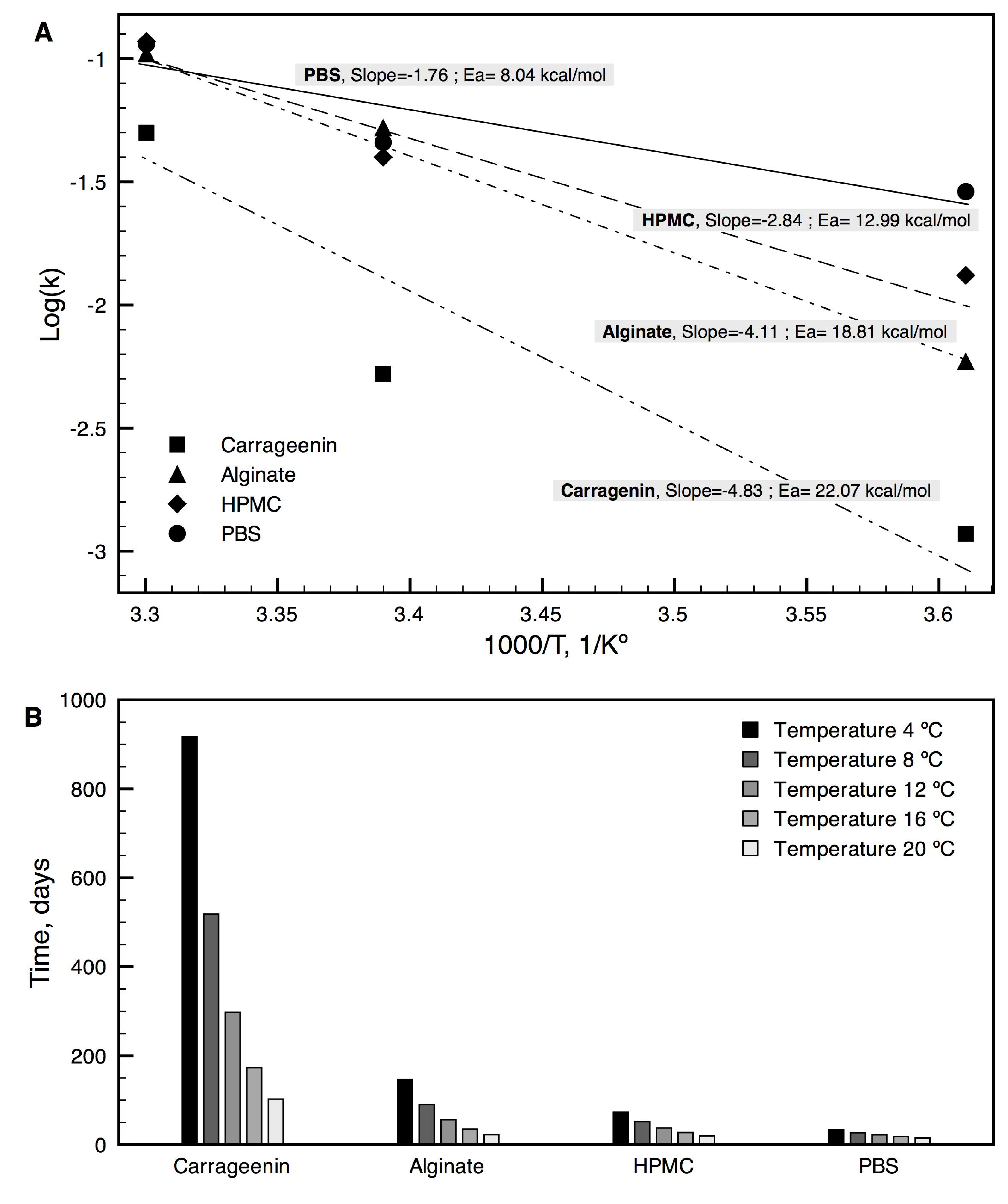 We studied the preservation of Azotobacter chroococcum C26 using three dry polymers: carrageenin, sodium alginate, and HPMC, using a method of accelerated degradation. Bacterial viability, as response variable, was measured at three temperatures in four different times, which was followed by calculation of bacterial degradation rates. Results showed that temperature, time of storage, and protective agent influenced both viability and degradation rates (P<0.05). We observed, using the Arrhenius thermodynamic model, that the use of polymers increased the activation energy of bacterial degradation compared to control. We obtained thermodynamic models for each polymer, based on the Arrhenius equation, which predicted the required time for thermal degradation of the cells at different temperatures. Analysis of the models showed that carrageenin was the best polymer to preserve A. chroococcum C26 since ~ 900 days are required at 4 ºC to reduce its viability in two log units. We conclude, therefore, that long-term preservation of A. chroococcum C26 using dry polymers is suitable under adequate preservation and storage conditions.